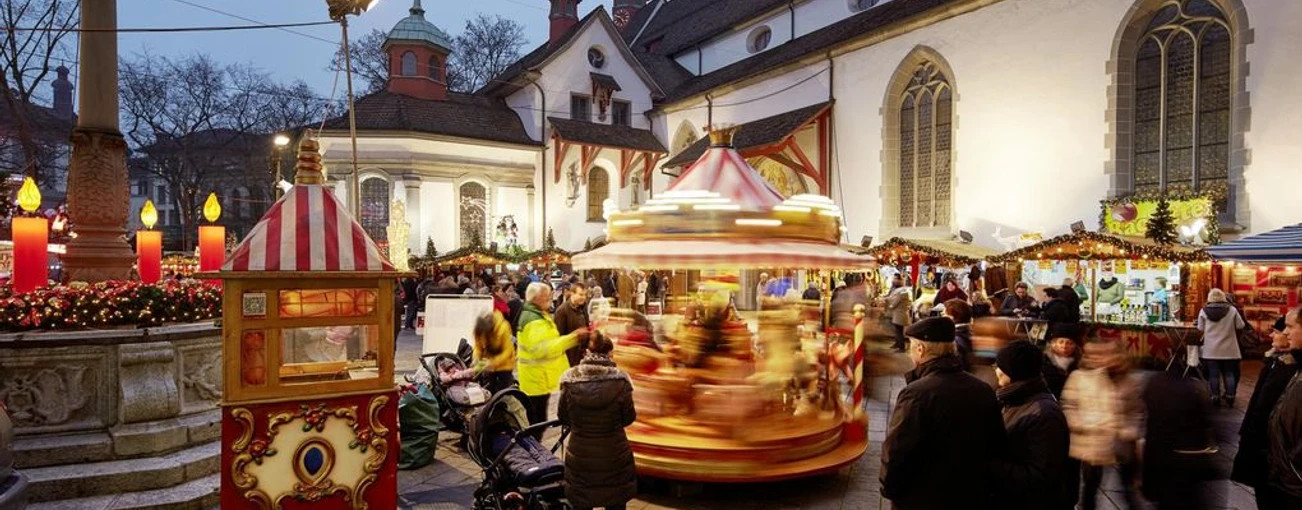 Tarde: viajar para Zurique (c. 45–60 min). À noite, explore o Christkindlimarkt na estação central (um dos maiores mercados indoor na Hauptbahnhof) e as decorações da Bahnhofstrasse.