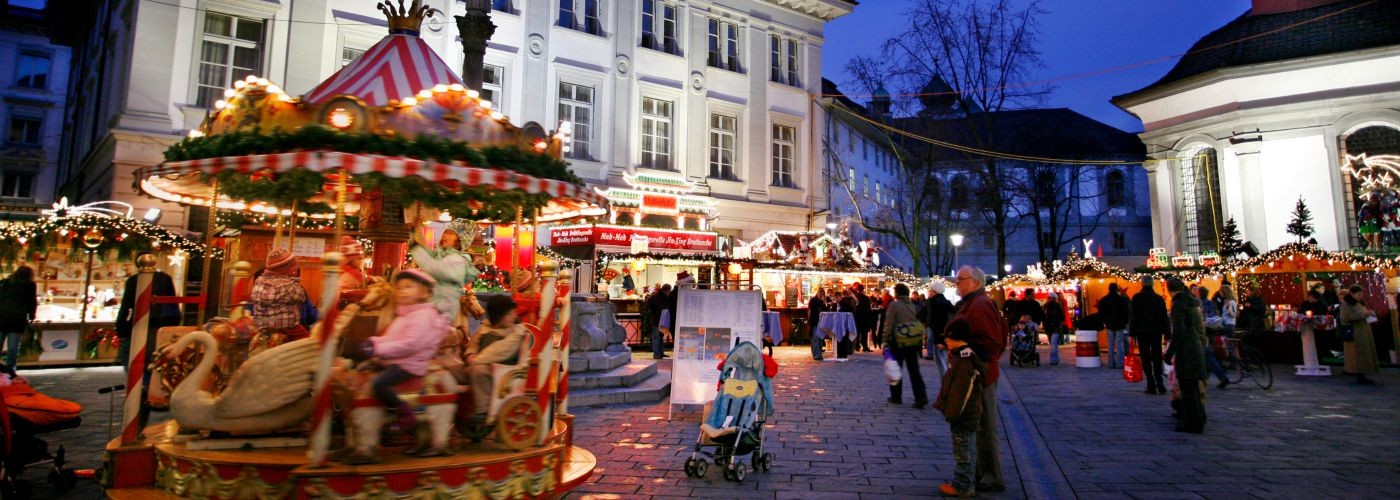 À tarde, mercado de Natal em Franziskanerplatz — bancas que vendem artesanato local, enfeites e comidinhas. Não perca a Ponte da Capela e a muralha da cidade iluminada. Excelente para paisagens de cartão-postal.